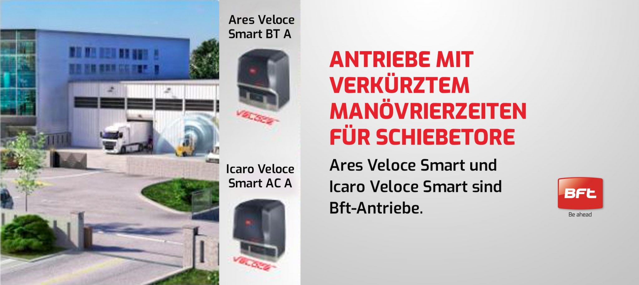 Ares Veloce Smart BT A und Icaro Veloce Smart AC A sind die Bft-Schiebeantriebe, die sich für Anwendungen eignen, die eine hohe Öffnungs- und Schließgeschwindigkeit und kurze Wartezeiten erfordern.